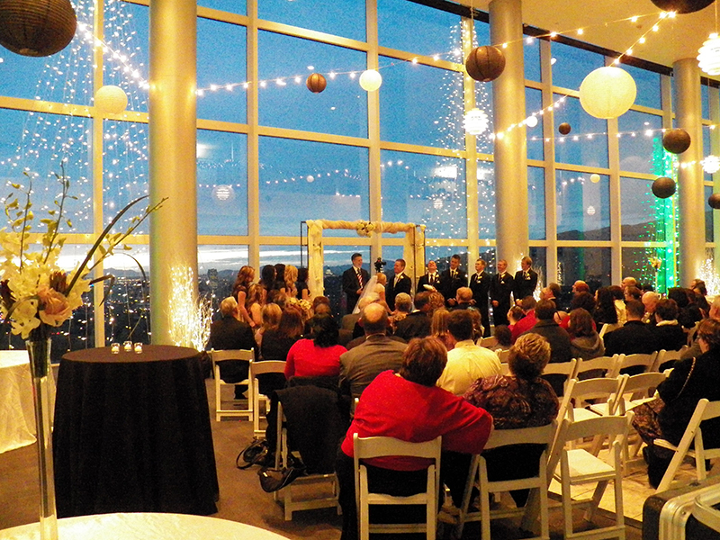 Wedding ceremony exchanging of rings, sound and music - University of Utah, Rice Eccles Stadium and Tower, Utah